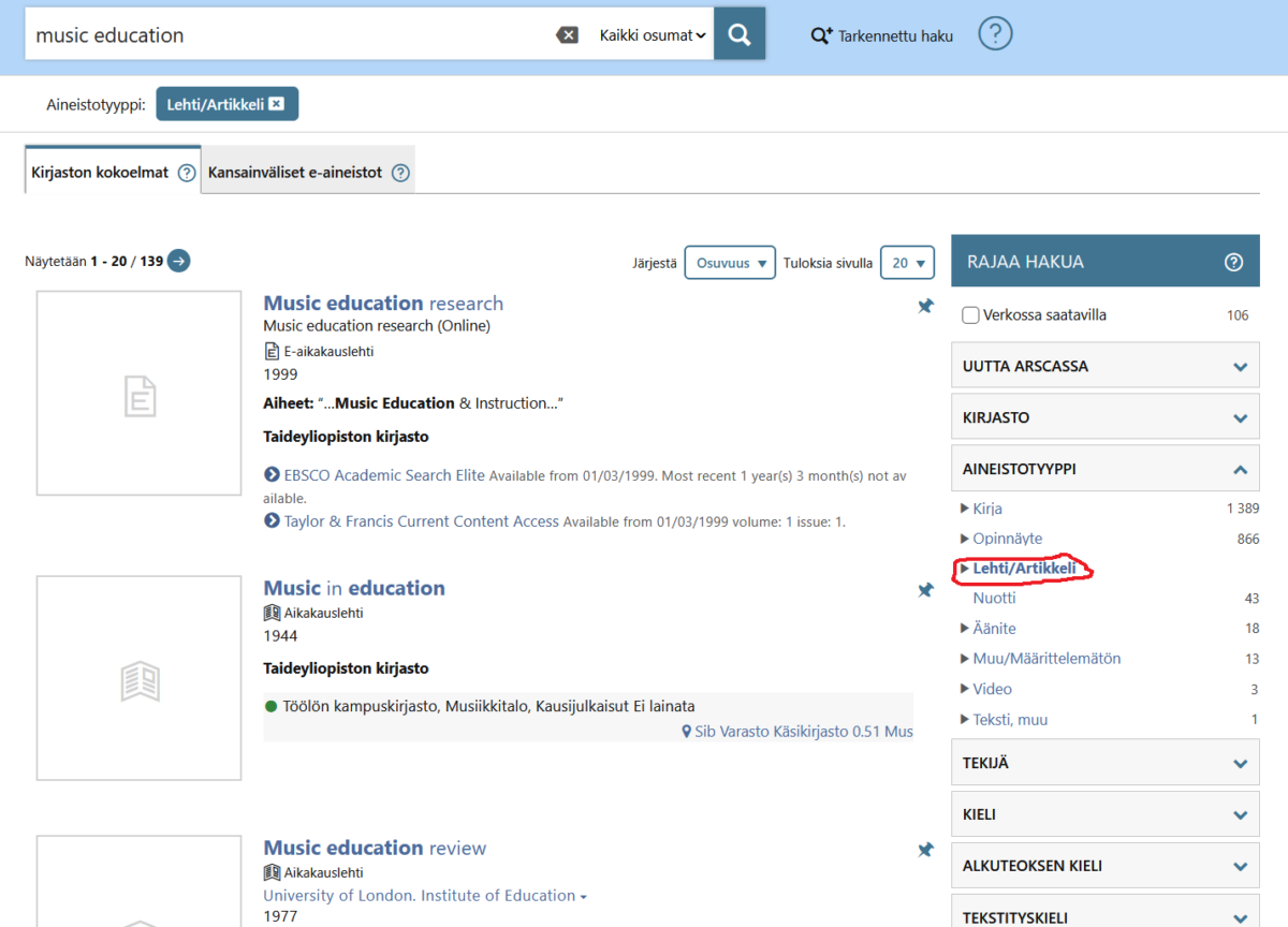 Paljon parempi tapa löytää haluamasi lehti on kirjoittaa hakulaatikkoon lehden nimi tai osa lehden nimestä (esim. music education) ja klikata hakutulosnäytöltä oikean reunan haun rajauksista aineistotyypin alta kohtaa “Lehti/Artikkeli” (ks. kuva alla).